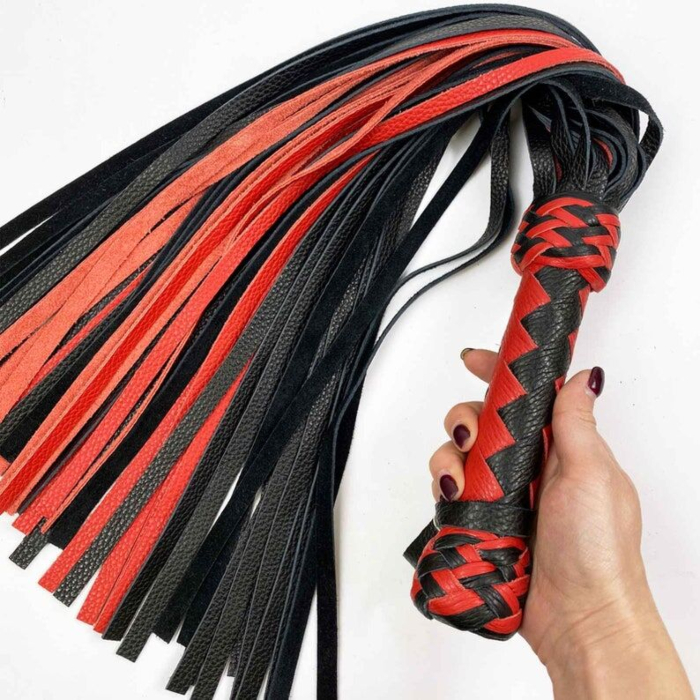 36. Черно-красный флоггер классический, натуральная кожа, 50 хвостов, по 50см, рукоятка 20см