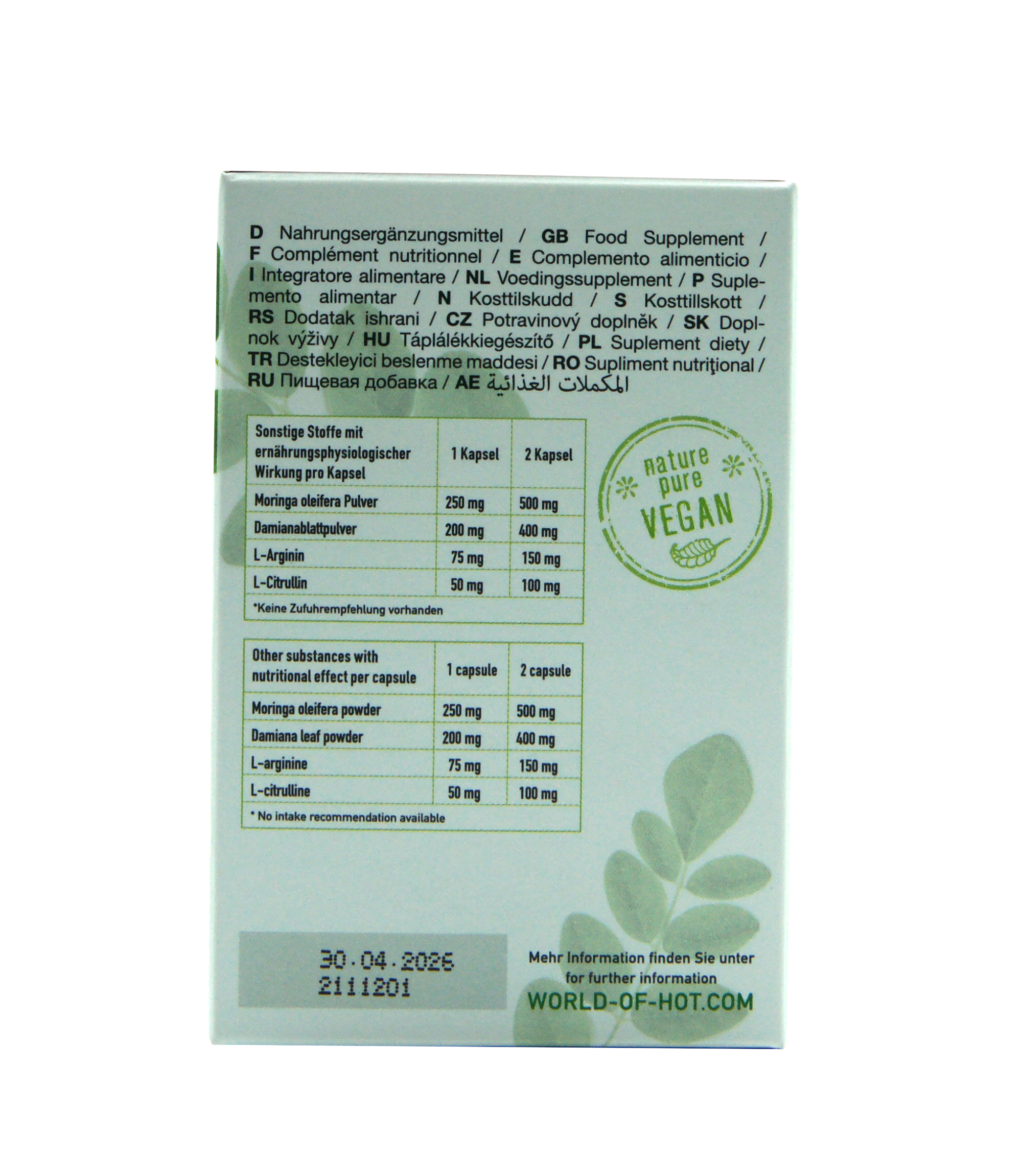 Капсулы Hot Bio Moringa Woman Power, созданные специально для женщин, которые стремятся к большему количеству энергии и жизненной силы. Формула включает активные ингредиенты из кенийской моринги и южноамериканского растения Дамиана, предназначенные поддерживать ваше внутреннее блестящее "я".
