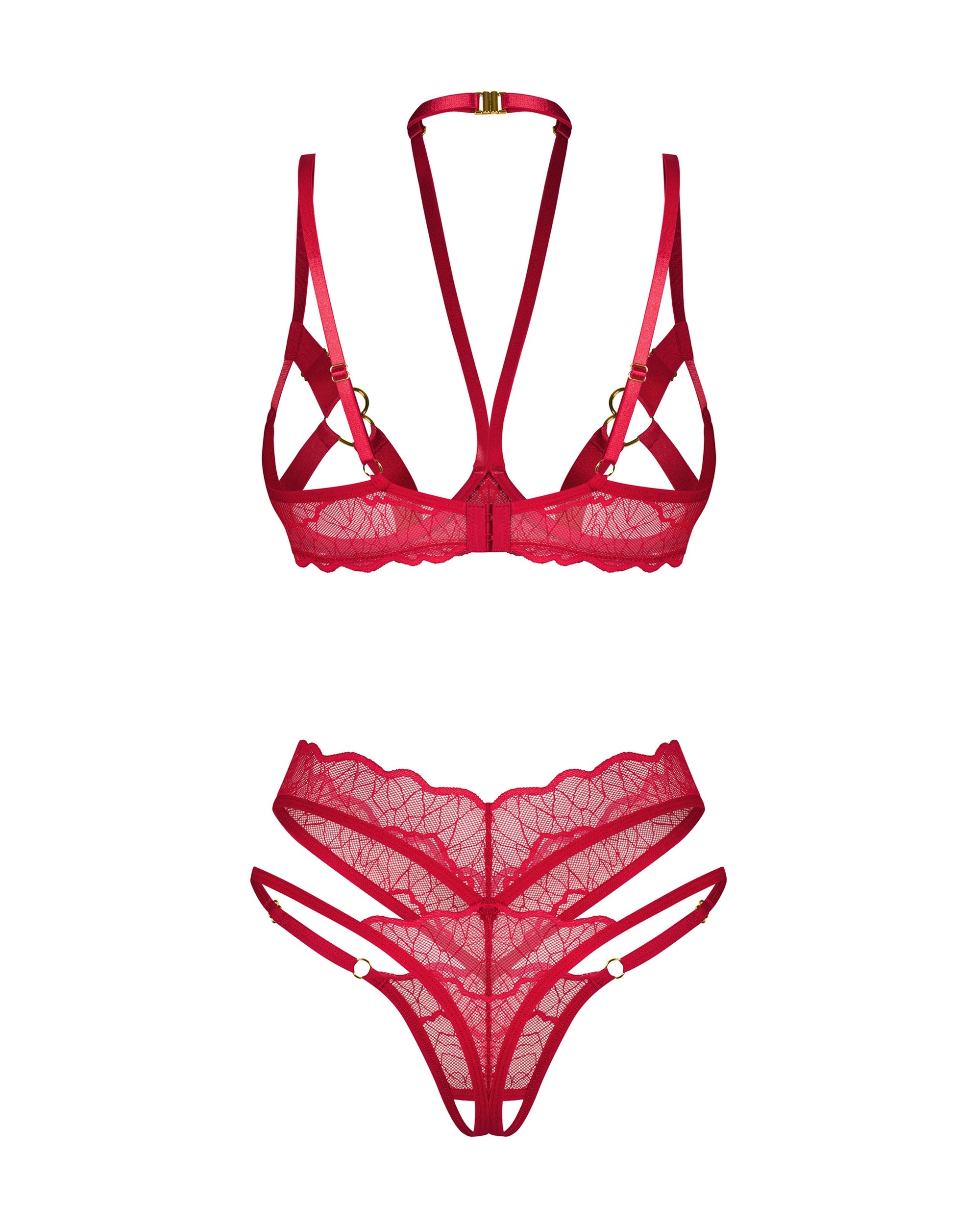 Пикантный комплект белья для создания соблазнительного образа, состоящего из бюстгальтера с открытым промежностью и стринги с высокой талией. Мягкое кружево, широкие бретели и соединители в форме сердца создают неотразимый игривый образ. Благодаря нескольким регулируемым бретелям, этот комплект обеспечивает индивидуальную и удобную посадку, что подчеркивает вашу привлекательность.