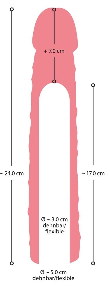 Общая длина 24 см, глубина ввода 17 см, внутренний диаметр 3 см (очень эластичный), наружный диаметр макс. 5 см. Вес 254 г.