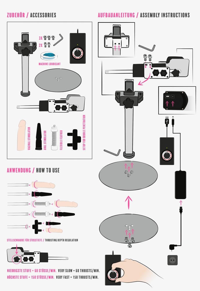 Развлечение без помощи рук: до 150 толчков в минуту! Секс-машина с регулируемой подставкой и двумя насадками. Регулируется с помощью пульта дистанционного управления и поворачивается почти на 360 °. Он предлагает до 150 многоскоростных толчков в минуту. Тонкий и современный дизайн позволяет пользоваться без помощи рук. Длина кабеля 1,5 метра с сетевой вилкой (вилка Schuko, тип F). Насадка для двойного проникновения в комплекте. Полная длина стойки 42 см, реалистичный фаллоимитатор 18 см, анальный фаллоимитатор 16,5 см.