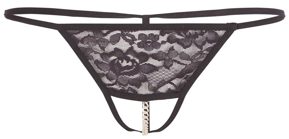 Черные кружевные стринги с цепочкой пересекающей промежностью. 100% полиамид