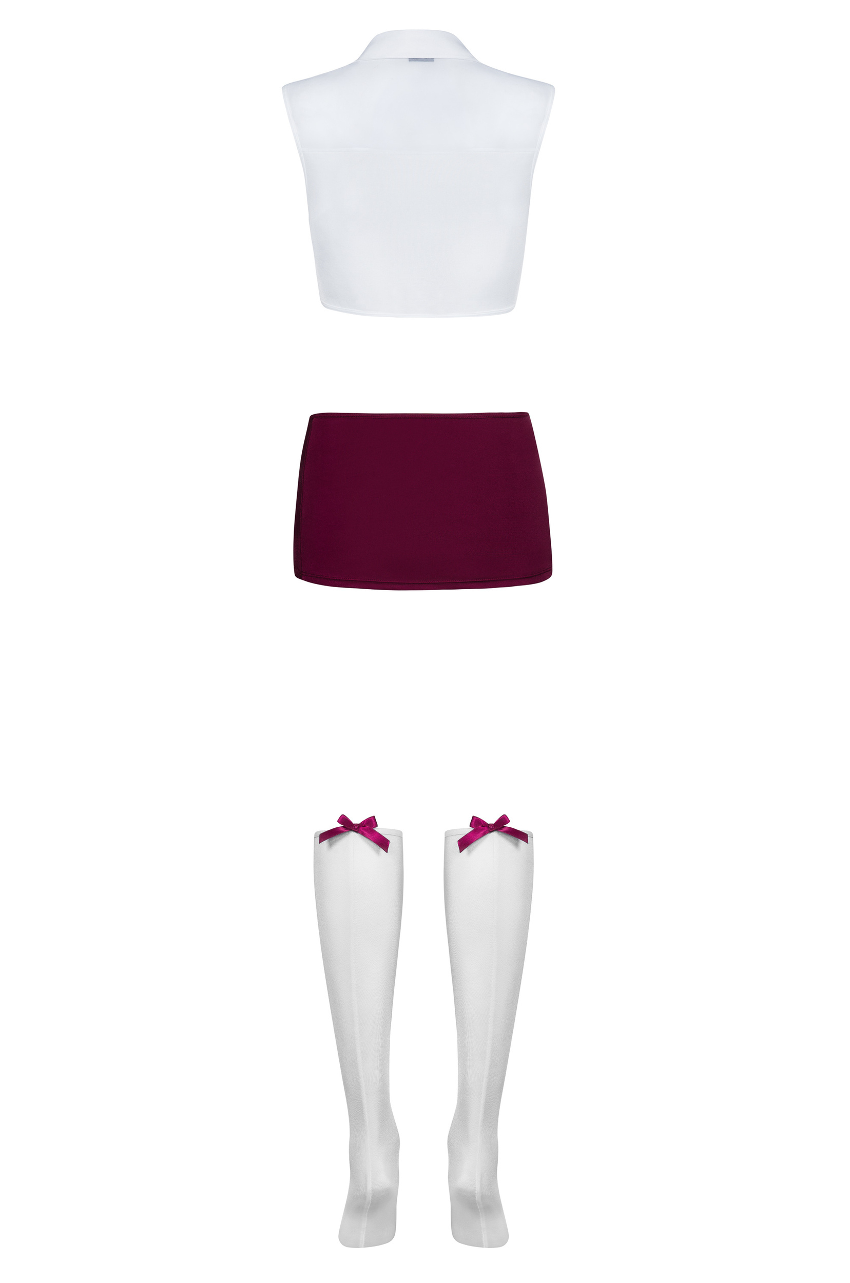 Еротичний костюм студентки Obsessive Student 4 pcs costume пошитий з м’якого стрейчевого матеріалу, який красиво обтягує тіло. Білий топ із глибоким краплеподібним вирізом оголює груди, акуратний комірець і стрічка-бантик нагадують, що перед нами представниця вишу. Сіточка над грудьми і на лопатках має дуже привабливий вигляд. Ззаду топ дуже аскетично прикриває спинку. Коротенька спідничка, більше схожа на широкий пояс, ледве прикриває стринги. Симпатичні білі гольфи трохи нижче колін мають неймовірний вигляд в ансамблі з топом і спідницею. А білі стрілки й атласні бантики ззаду гольфів додають образу сексуальності.