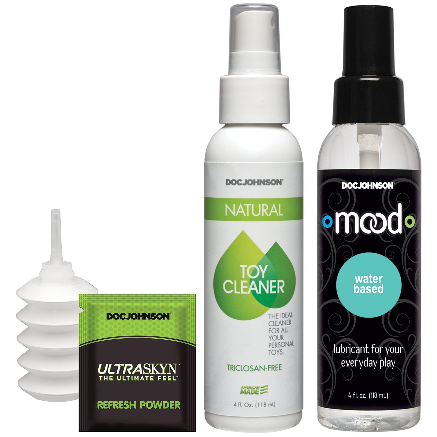 - Дезінфекційний спрей Doc Johnson Natural Toy Cleaner (118 мл) без триклозану, сульфатів та парабенів — натуральний засіб на основі цитрусових олій. Рідина ефективно очищає іграшки та не псує їхній матеріал. Спрей представлений серед продукції бренду також окремим товаром.