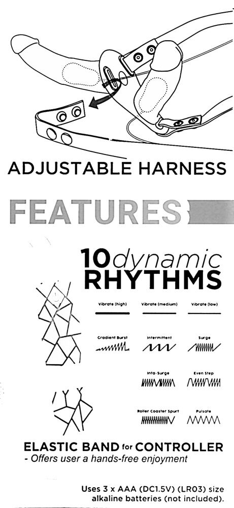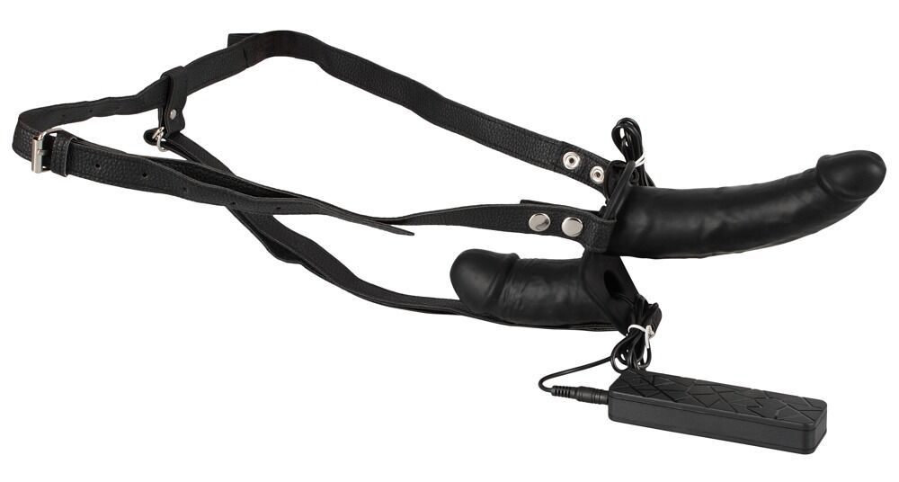 - Два вібратори у вигляді пеніса: Великий зовнішній вібратор для пасивного партнера: довжина 17 см, діаметр від 3 до 4,3 см.