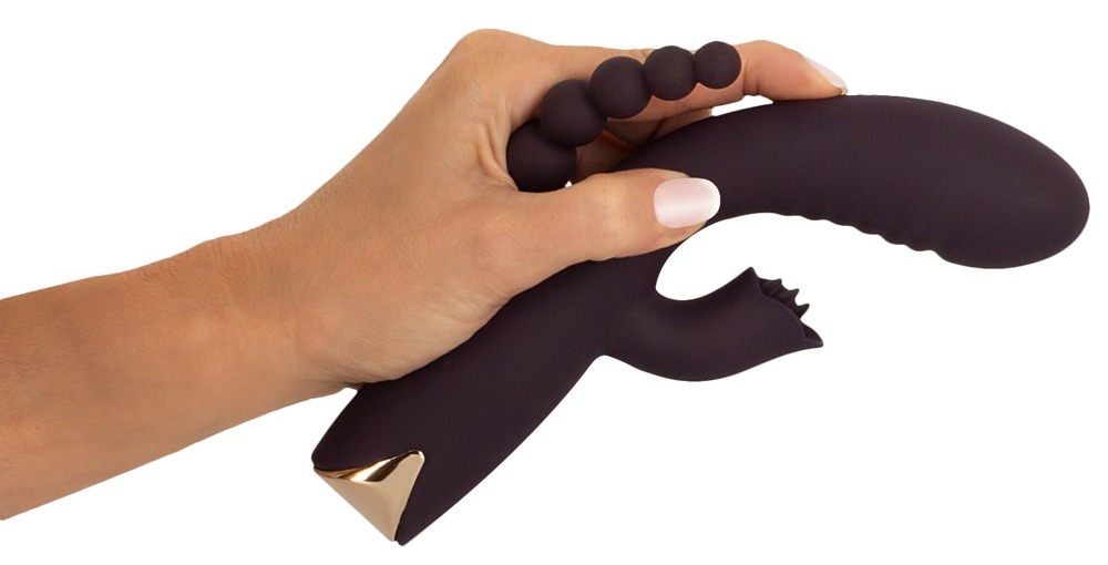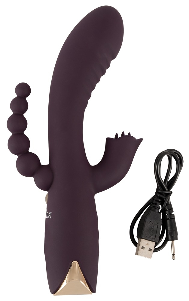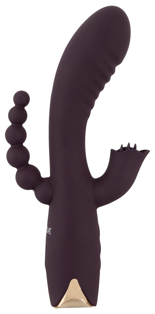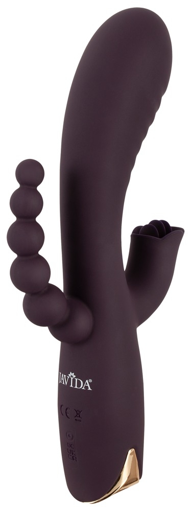 Потрійний вібратор від Javida - це елегантно вигнутий кролячий вібратор з анальним стимулятором, який забезпечує одночасну вагінальну, кліторну та анальную стимуляцію. Його вигнутий стрижень завдяки своїй рифленій текстурі масажує піхву й особливо точку G. Витончений кліторальний стимулятор ідеально націлює зовнішні гарячі точки своїми м’якими язичками, а гнучкі кульки стимулюють анальний регіон. Всебічна стимуляція в найкращому вигляді!